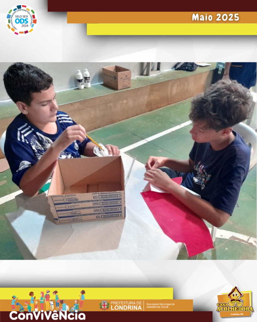 Os adolescentes realizaram atividade de papietagem em lixeiras reutilizando baldes de tinta que serão colocadas nos pontos de ônibus próximos à instituição.