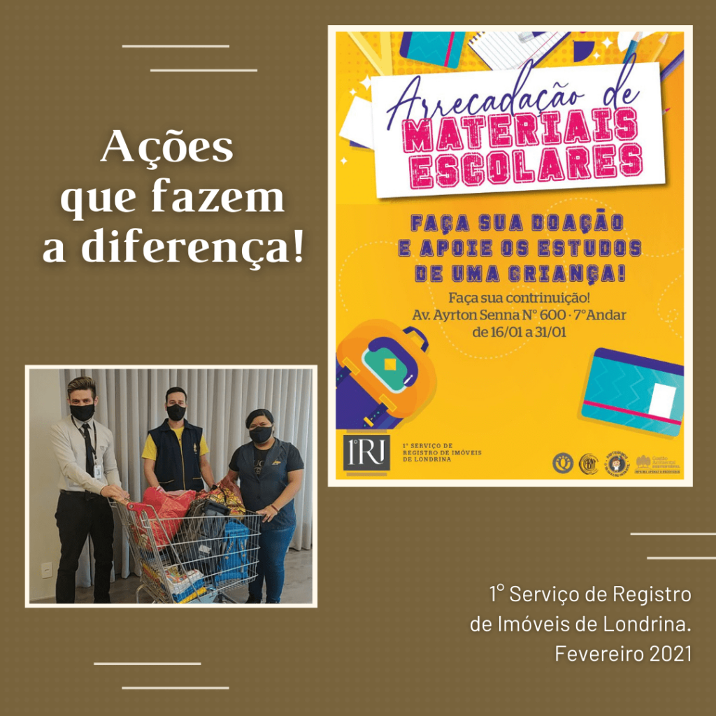 No mês de fevereiro recebemos também uma doação de Materiais Escolares arrecadados na campanha organizada pelo 1° Serviço de Registro de Imóveis de Londrina! Gratidão pelo carinho e cuidado para com nossas crianças e adolescentes!!!