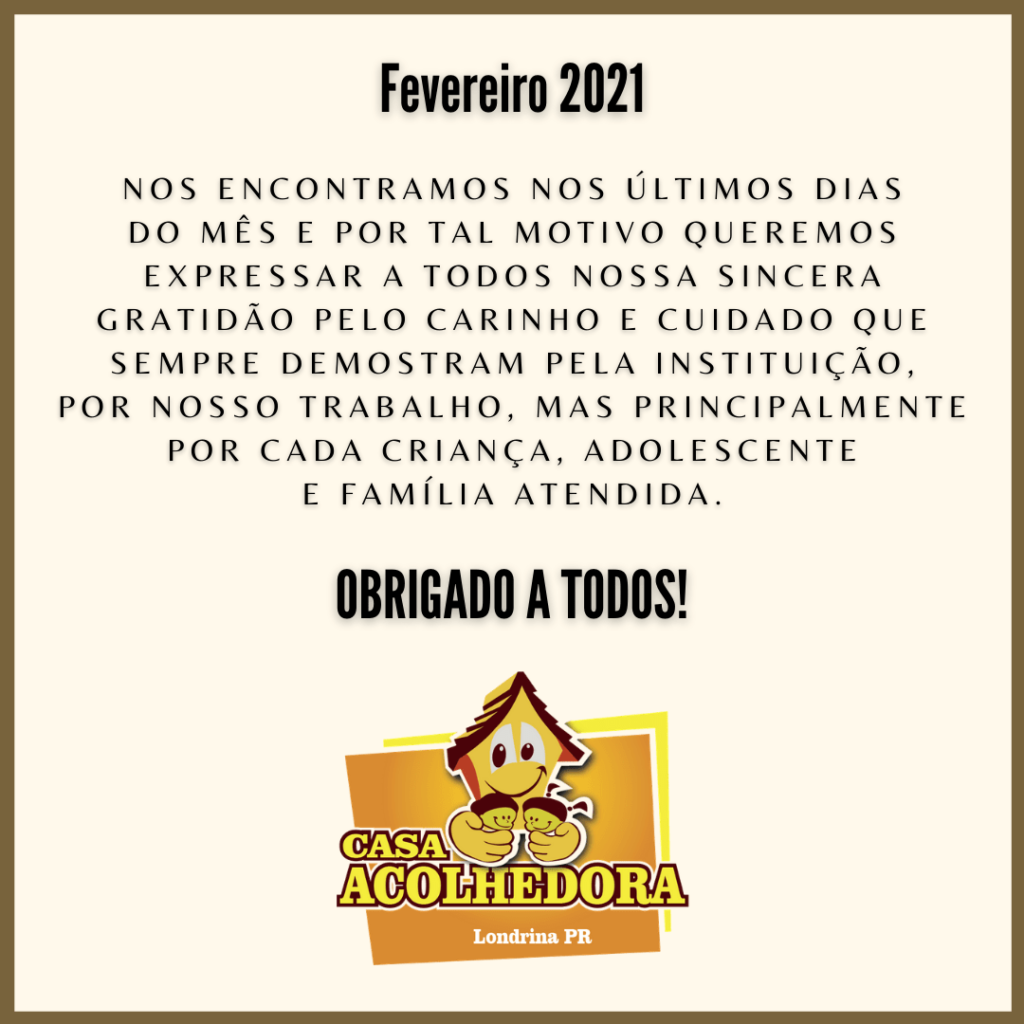 Encerrando o segundo mês do ano 2021, a Casa Acolhedora organizou uma ação que permitiu que sejam entregues 65 cestas diferenciadas para nossas famílias! Nosso sincero agradecimento aos colaboradores!!! Confira o vídeo.