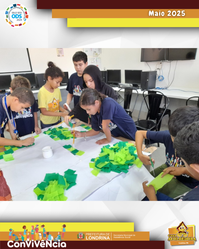 Os educadores continuaram junto aos educandos a reflexão e elaboração de materiais relacionados ao meio ambiente como: Criação de mural sobre poluição sonora, árvores de papelão para maquete e passaram verniz na lixeiras.