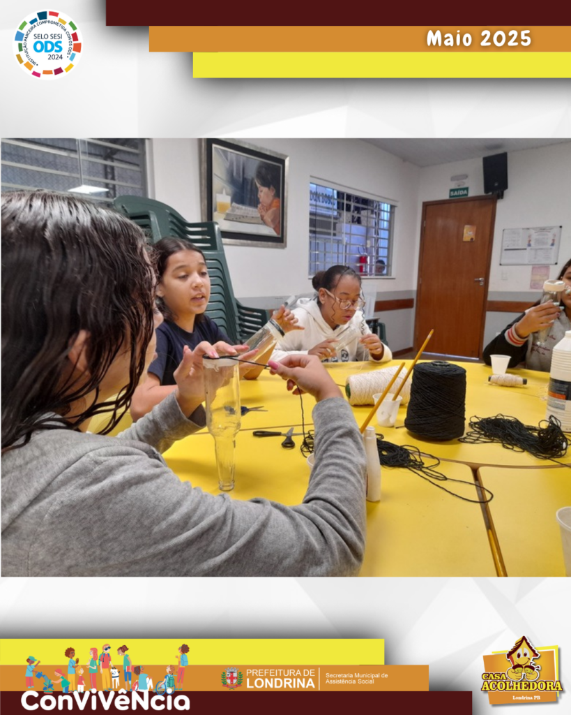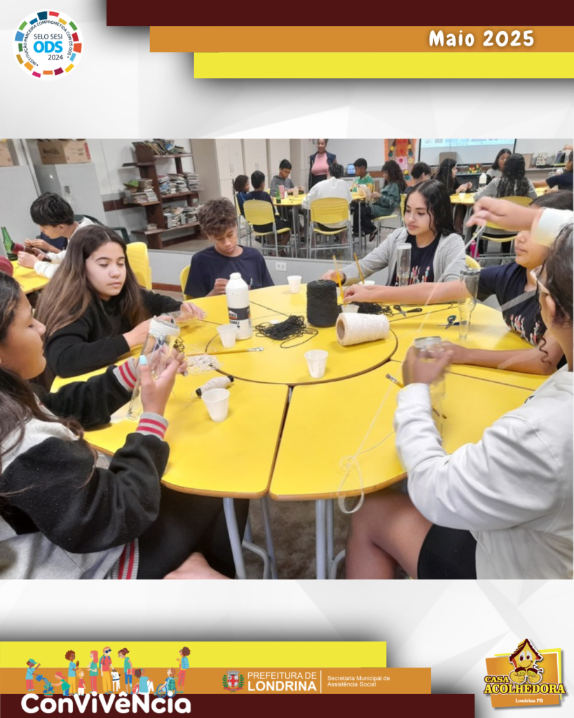 Os adolescentes realizaram uma oficina de reaproveitamento de garrafinhas de vidro, aplicaram cola em pequenos pedaços da garrafa, enrolaram o barbante e, com a ajuda de um pincel, foram ajeitando e pressionando para que fique bem colado e sem folgas, criando assim um lindo vaso de flor.