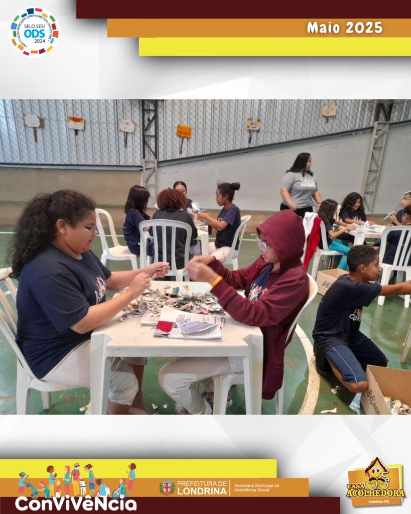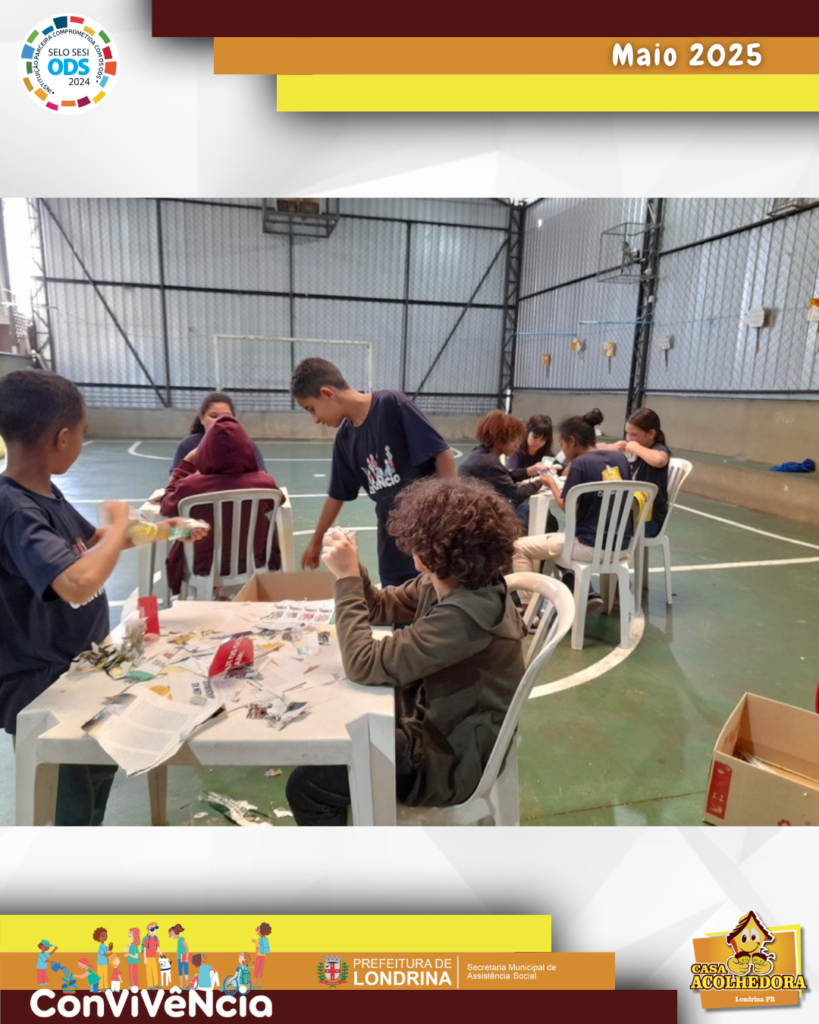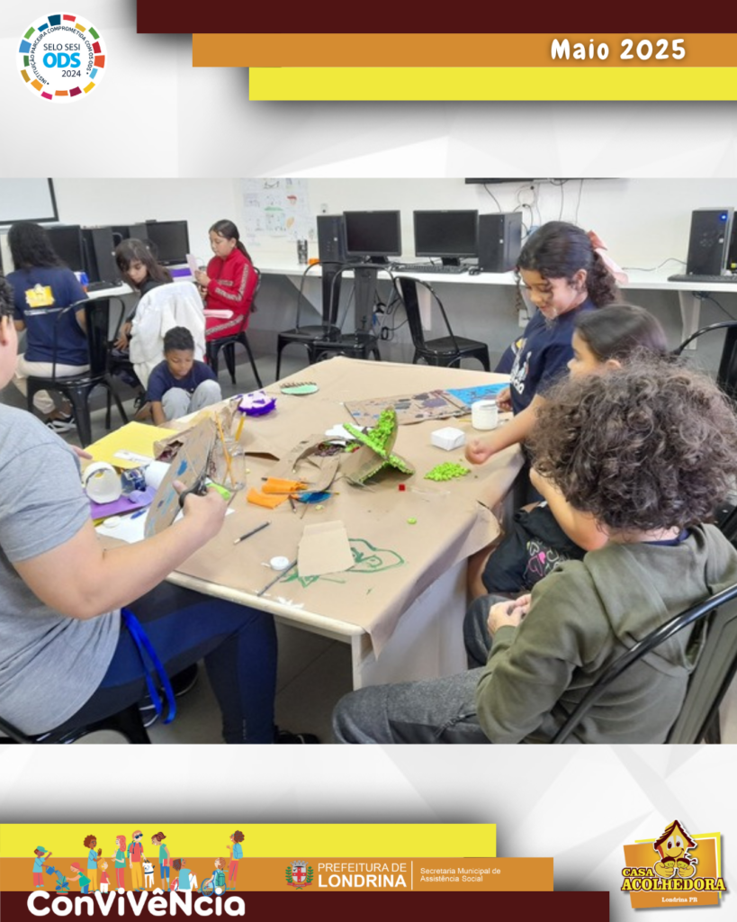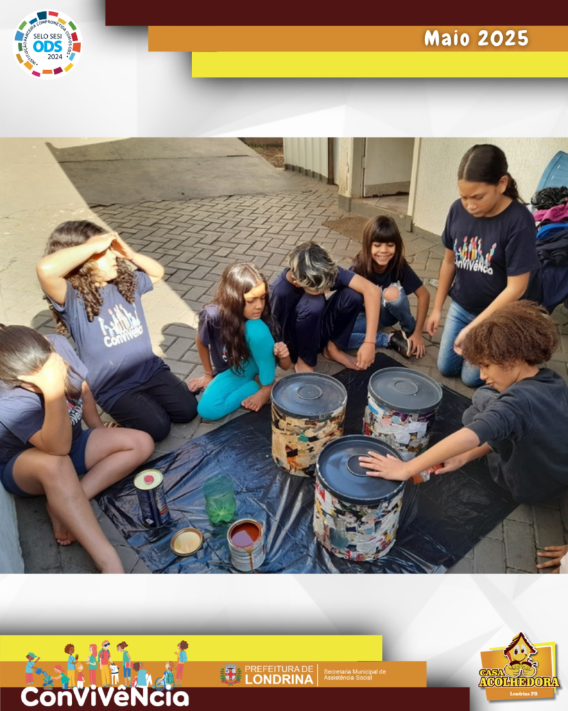 Criação de mural sobre poluição sonora, árvores de papelão para maquete e passaram verniz na lixeiras.
